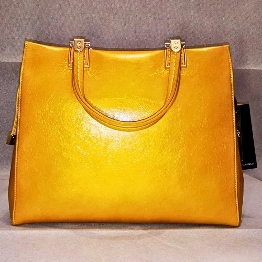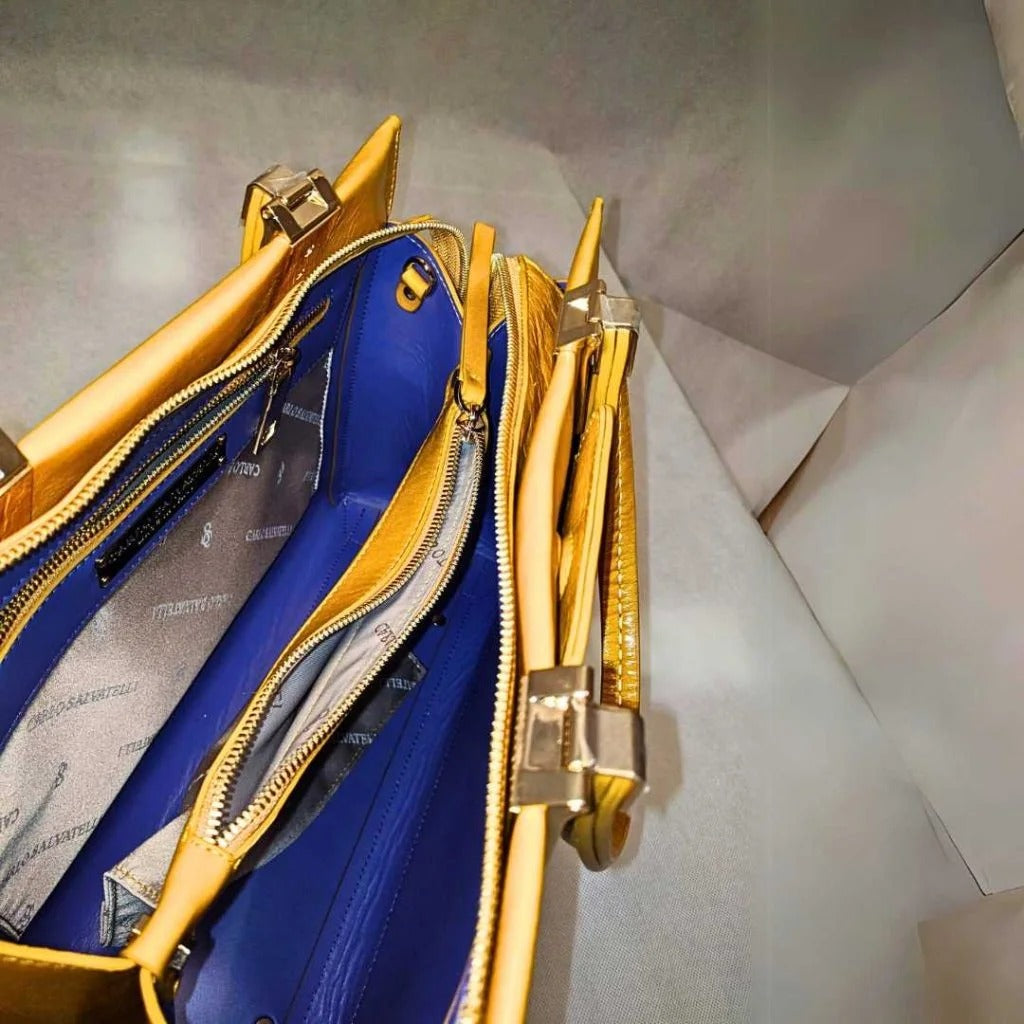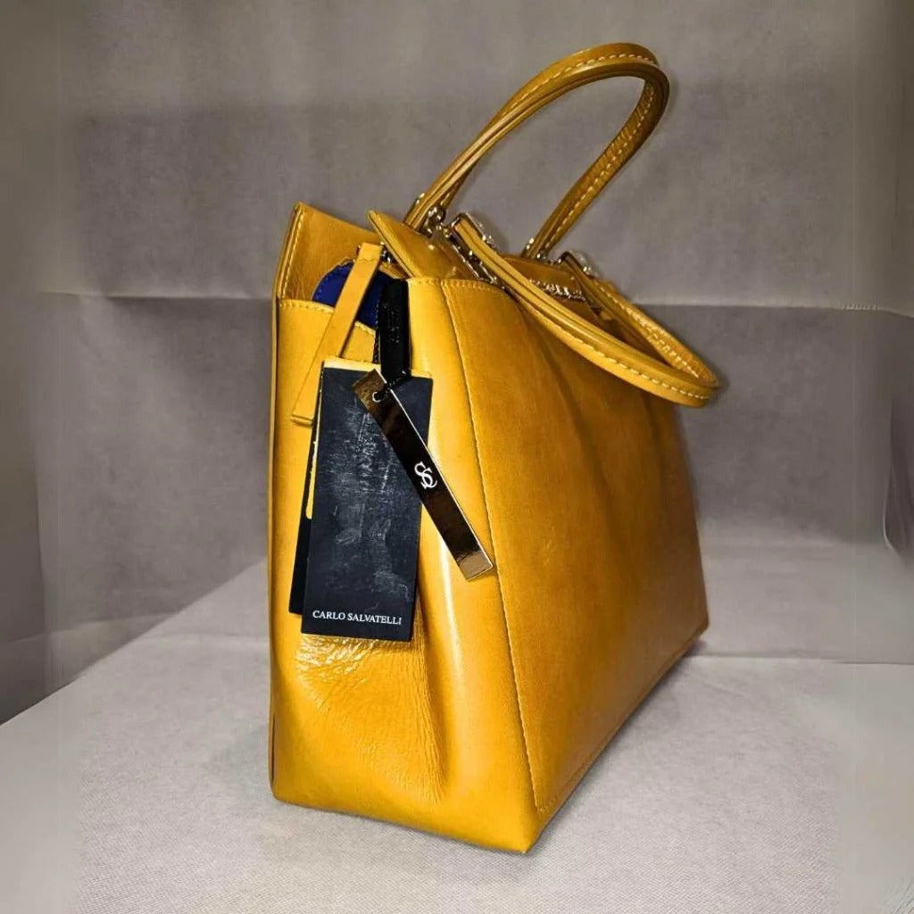 Introducing the Carlo Salvatelli Swami Bag in the captivating Alias Ocra color. Crafted with meticulous attention to detail, this luxurious accessory exudes elegance and sophistication.