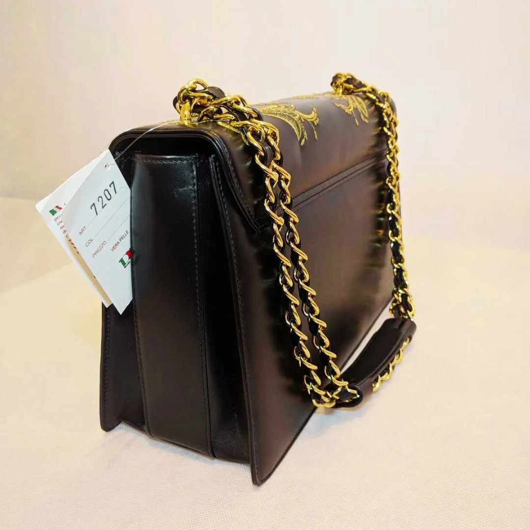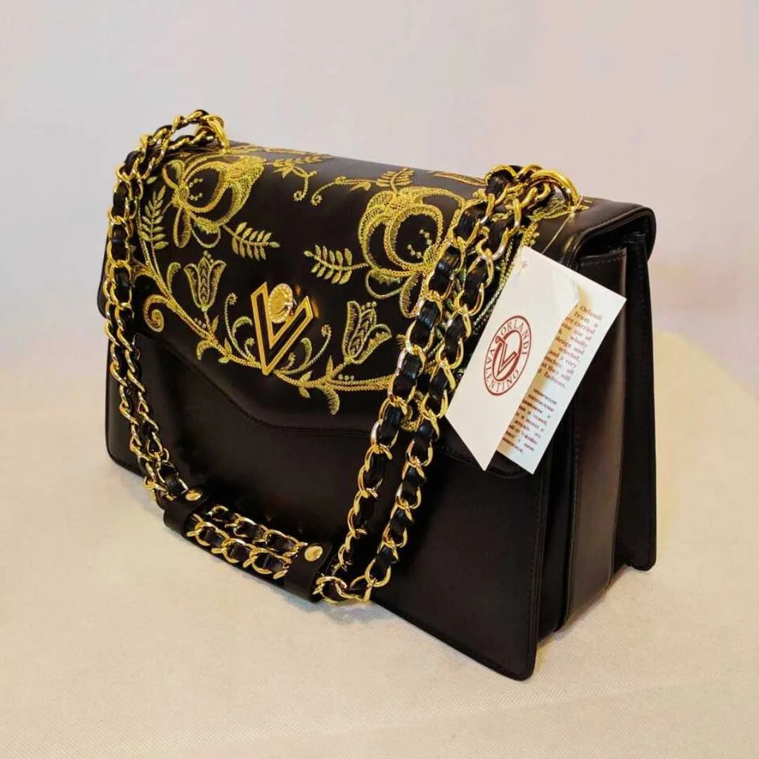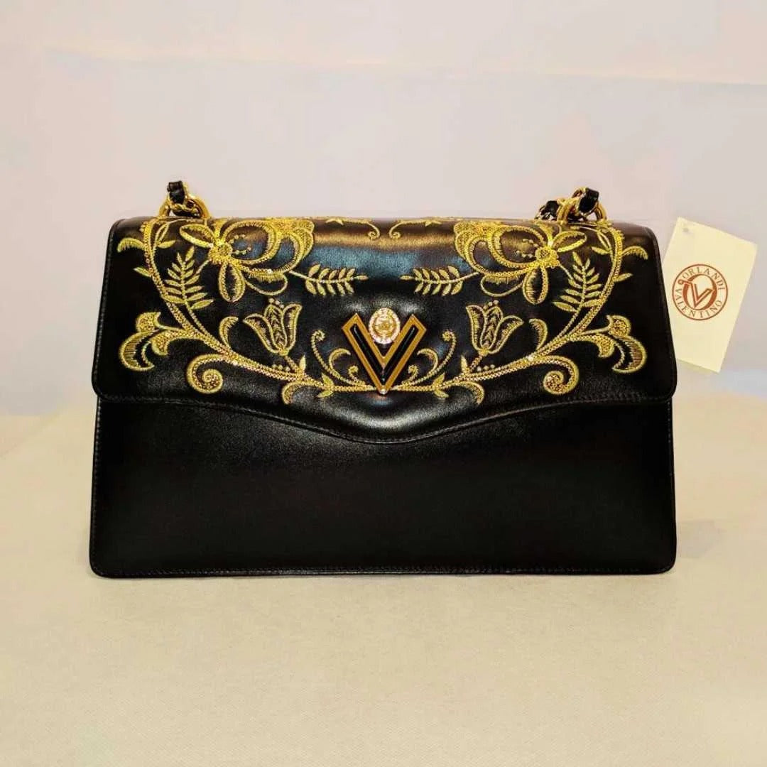 The Black Valantino Orlandi Leather Handbag embodies the pinnacle of luxury craftsmanship, crafted by the esteemed House Valentino Orlandi. Made from the finest Italian leather, it exudes elegance and durability, promising a timeless accessory for the discerning fashion enthusiast. Its sleek silhouette is accentuated by exquisite gold embroidery and double gold hand straps, complete with a supple leather handle for effortless carrying options.